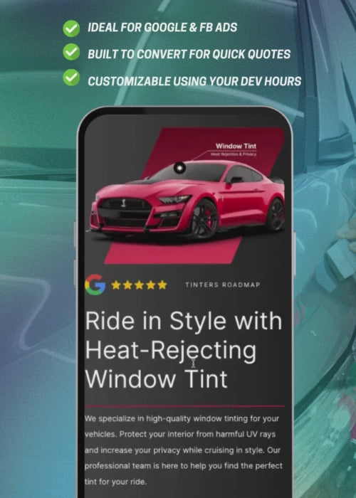 Detailers Roadmap has the perfect pre-made window tint landing page. Ideal for Google and Facebook pay-per-click ads. We handle the heavy lifting by setting up the page, integrating it into your site, and directing form submissions to your registered email address.